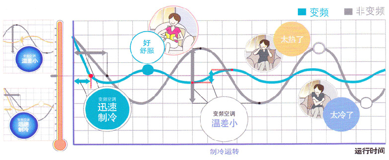 變頻空調能快速實現(xiàn)制冷制熱,在啟動初期,能以最大制熱(冷)量進行強力運轉,迅速達到設定溫度。空調在達到設定溫度后,壓縮機能根據(jù)室內負荷調整輸出功率,使室內溫度始終處于相對穩(wěn)定狀態(tài),減小溫度變化,避免忽冷忽熱。 而非變頻空調是當室溫到達設定溫度后,壓縮機停止工作,室溫上升。升至一定溫度后,再次啟動。引起室溫波動,人體感到不舒服。