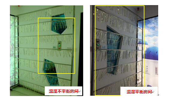 為了更好地檢測中央空調的出風和氣流,在正對空調出風口的對面拜訪了一個流蘇架,這樣就能很清楚地看出空調的風向和風速了。